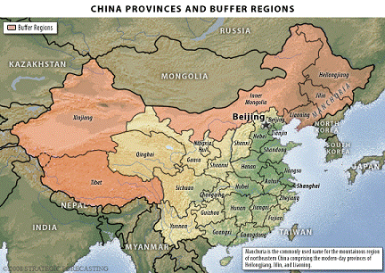 surround this heartland - Tibet, Xinjiang province (home of the Muslim Uighurs),