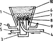 Dispozitiv pentru irigarea punctiforma: 1-vas de ceramica; 2-suport; 3-tub interior; 4-conducta de intrare a pei; 5-conducta de plecare; 6-capac din PVC; 7-orificii; 8-sita PVC sau geotextil; 9-nisip; 10-pamant