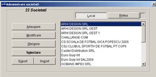 Din fereastra initiala alegeti societatea creata si apasati butonul Selectare. Pentru modificarea numelui societatii sau stergerea acesteia din lista se apasa Modificare, respectiv Stergere.