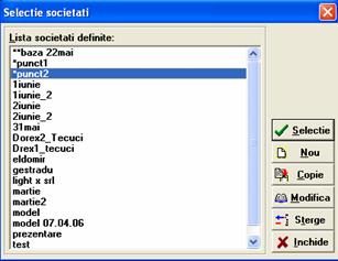 Primul pas la deschiderea programului este selectarea societatii de lucru, executand dublu clic pe campul de langa eticheta "Societatea" si selectand apoi din lista intitulata Selectie societati.