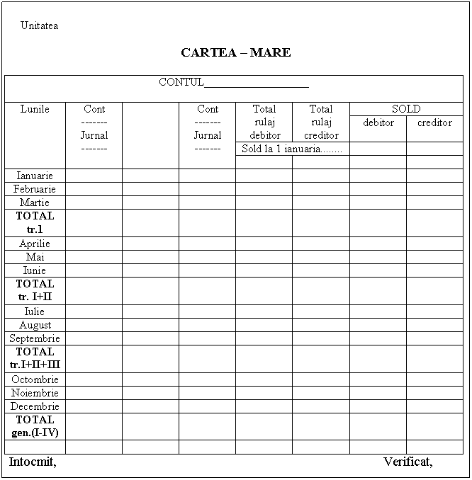 c) Intocmirea lunara a registrului cartea-mare propriu-zisa in care, pe foaia deschisa pentru fiecare cont se preia: