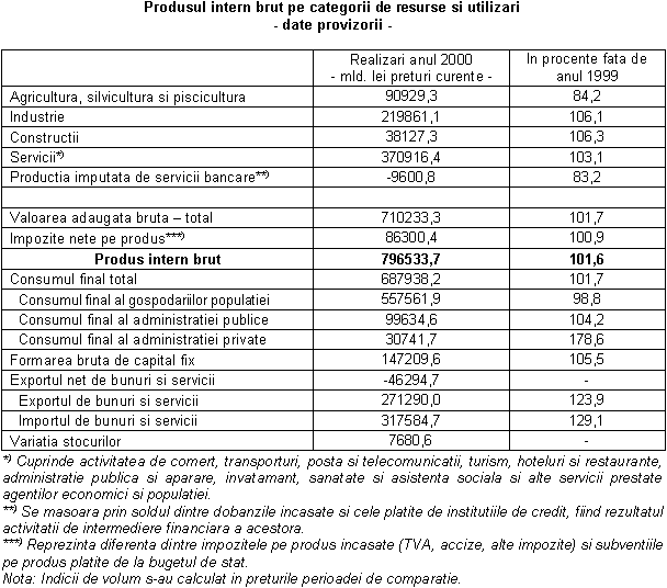 Produsul intern brut estimat pentru anul 2000 a fost de 796533,7 miliarde lei preturi curente, in crestere, in termeni reali, cu 1,6% fata de anul precedent. Cresterea a fost determinata in mod semnificativ de marirea volumului de activitate si, in consecinta, a valorii adaugate brute din industrie (+6,1%), constructii (+6,3%) si servicii*) (+3,1%) care, impreuna, reprezinta 79,0% din produsul intern brut; valoarea adaugata bruta realizata in agricultura, silvicultura si piscicultura a inregistrat o scadere cu 15,8%, datorita, in principal, conditiilor climaterice nefavorabile.