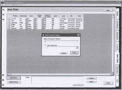 "Atributele' sunt caracteristicile produsului iar " intrebarile', reprezinta cerintele din baza de date a clientilor. Atributele pentru fiecare produs vor fi aceleasi de fiecare data cand se ruleaza sistemul iar valoarea intrebarilor va fi schimbata de fiecare data cand clientul ruleaza sistemul. Introducerea intrebarilor se realizeaza prin apasarea pe butonul adauga o noua intrebare.