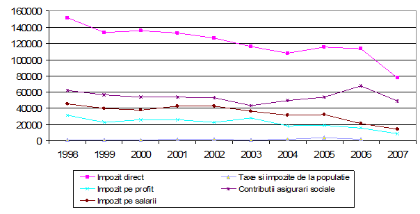 Analizand graficul de mai sus se observa ca valoarea acestor taxe si impozite a inregistrat o scadere semnificativa incepand cu anul 2005, an in care s-a introdus cota unica de impozitare de 16%.