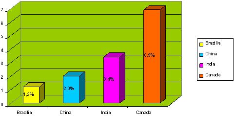 In evolutia PIB-ului Chinei se observa o crestere accelerata mai ales in ultimi ani, crestere care se mentine inca din 2002 cu o rata medie de 8 % pe an.Evolutia economiei Indiei este mult mai lenta comparativ cu cea a Chinei avand o rata de crestere anuala de 5 %.Cea mai mare rata de crestere a fost inregistrata de catre India in 2004, crestere estimta la 7 %. Cu toate ca , in comparatie cu economia Chinei India se manifesta mai lent asta un inceamna ca aceasta un este una eficienta si productiva, India situaduse pe locul patru in ceea ce priveste marimea economica.