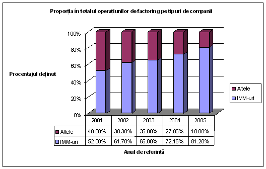 Procentajul IMM-urilor in volumul total al serviciilor de factoring oferite de Banca Comerciala Romana (total factoring international si factoring intern) in perioada 2001 - 2005
