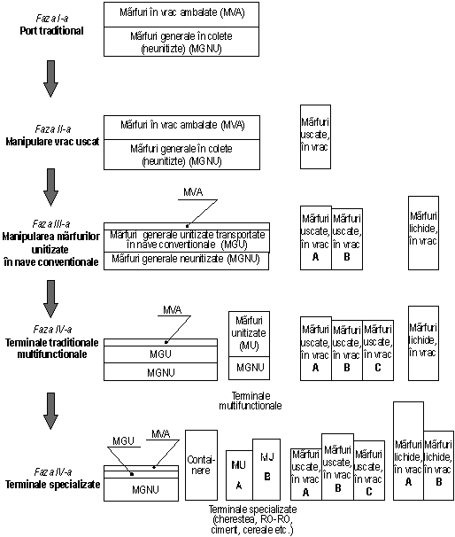 Fazele principale ale dezvoltarii unui port de la portul traditional la portul actual modern sunt prezentate in figura 2.