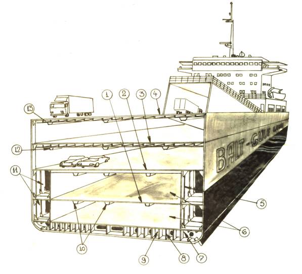 7-compartiment masini; 8-tanc apa; 9-magazie materiale pentru dragaj; 10-camera carmei; 11-pereti etansi.
