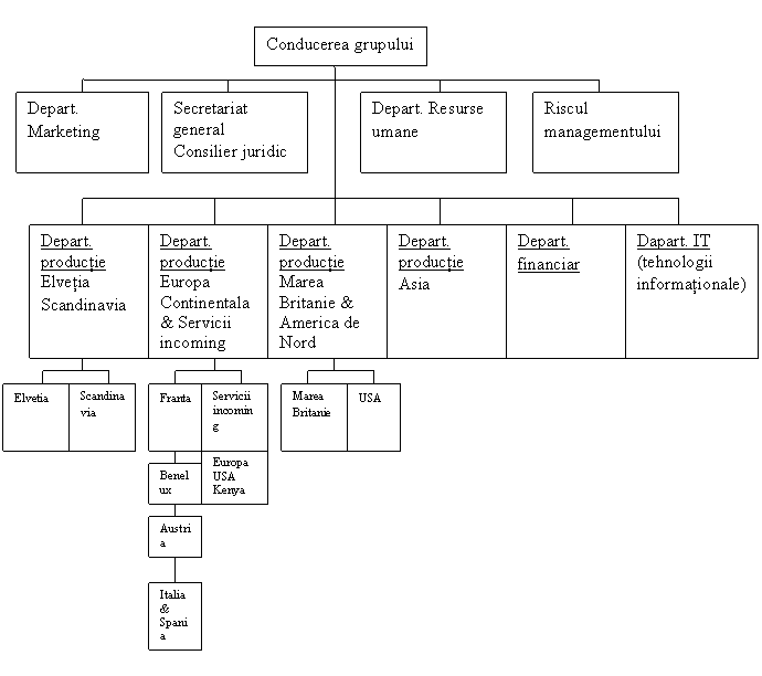 In scopul evidentierii complexitatii structurii organizatorice a unui grup turistic (constituit in jurul unui mare touroperator), in fig. 3 prezint organigrama grupului elvetian Kuoni, lider mondial in organizarea pachetelor turistice " la carte" si a celor organizate spre destinatii indepartate.