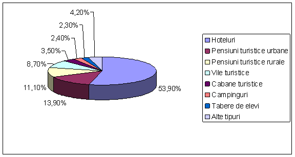 In totalul capacitatii de cazare turistice in functiune, hotelurile au detinut o pondere de 53,9%, pensiunile turistice urbane 13,9%, pensiunile turistice rurale 11,1%, vilele turistice 8,7%, cabanele turistice 3,5%, campingurile 2,4%, taberele de elevi si prescolari 2,3% si 4,2% au reprezentat celelalte tipuri de structuri de primire turistica.