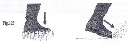 procedeu, primul pas va fi executat cu piciorul din amonte ( varful bocancului se introduce in panta cu zapada oblic pe directia de inaintare- fig.123).Dupa fixarea acestuia, se paseste cu piciorul din aval, infingand calcaiul acestuia in panta (fig.124).