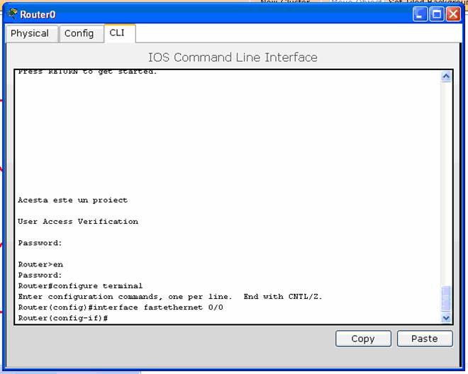 Implicit toate interfetele unui router sunt down (din motive de securitate).Pentru activarea lor folosim comanda no shutdown. Observam imediat ca interfata se ridica printr-un mesaj dat de router : Interface fastethernet 0/0 ,changed state to up.