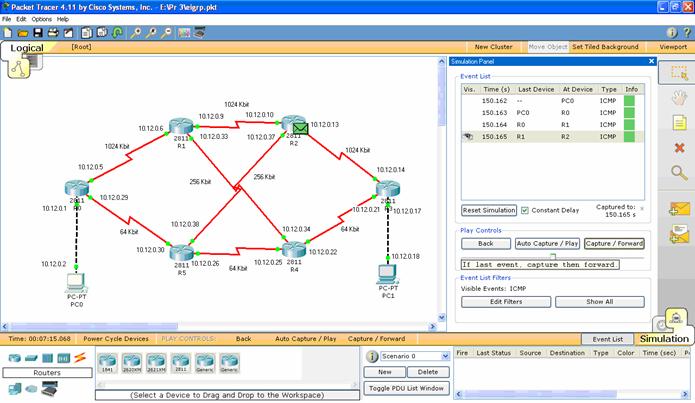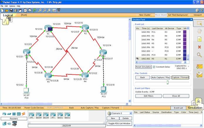 Cu ajutorul butonului Capture/Play putem observa traseul pachetelor. O alta cale de a vedea acest luctru este folosirea comenzii traceroute (tracert 10.12.0.18).