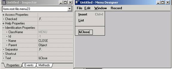 Se observa ca bara Insert din meniul File are numele Form.Root.File.Insert. Fiecare bara este tratata ca un obiect si are propriile proprietati. Evenimentul unic asociat este OnClick, iar metoda este una singura Release().