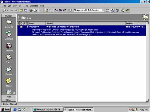 Outlook este un program de gestionare a informatiilor personale (personal information manager - PIM). Se poate folosi acest program pentru a trimite si a primi mesaje e-mail, atat intr-o retea locala, cat si in Internet; el poate fi util si pentru realizarea unei agende personale. Outlook poate crea si o lista cu probleme de rezolvat, o baza de date cu nume si adrese si poate tine evidenta tuturor fisierelor deschise in care se lucreaza cu alte programe ale pachetului Office 97. In concluzie, aceasta aplicatie poate inlocui cu succes munca unei secretare personale.