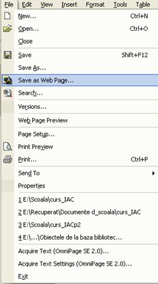 Documentul poate fi salvat si ca pagina web cu optiunea Save as Web Page. din meniul File.