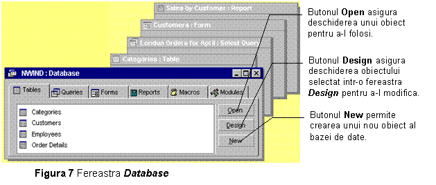 Pentru a lucra cu toate obiectele dintr-o baza de date Microsoft Access folositi fereastra Database (vezi figura 7). Executati clic pe o eticheta (spre exemplu, Tables) pentru a vizualiza o lista a tuturor obiectelor de acest tip existente. Folosind butoanele din dreapta listei puteti deschide sau modifica obiectele existente si puteti crea noi obiecte.