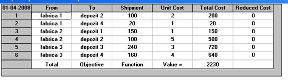 Se poate observa ca prin aplicarea analizei "What-If " ca urmare a cresterii costului de transport dintre fabrica 2 si depozitul 1 costul total de transport va fi 2830 si va creste cu 600 Euro modificandu-se in timp si cantitatile de transportat astfel:
