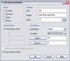 F se traseaza semnul de rugozitate; se defineste atributul "Rug" cu comanda Attdef conform casetei de dialog completate din figura 12.4;
