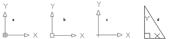 Daca acest simbol nu poate apare in origine, de exemplu aveti marita o zona a desenului iar originea sistemului este in afara ecranului, simbolul sistemului de coordonate va apare implicit in coltul din stanga jos al ecranului (b). Sensul pozitiv al axei Z va fi implicit orientat in afara ecranului. Patratul nu va fi afisat daca axa Z este orientata inspre ecran. Orientarea axei Z este mai putin importanta la desenul plan (2D) dar devine indispensabila in cazul desenelor tridimensionale (3D). Utilizatorul poate crea un sistem propriu de coordonate (UCS - User Coordinate System), a carui origine este aleasa convenabil si care sa faciliteze desenarea prin raportare la aceasta noua origine. UCS este identificat printr-o cruce mica in originea sistemului (c). Daca originea este in afara ecranului aceasta cruce nu mai apare, simbolul pentru UCS mutandu-se in coltul din stanga jos al ecranului. In figura (d) este prezentat simbolul sistemului de coordonate asa cum apare in formatul Paper space (formatul imprimabil pe hartie despre care se va discuta la sfarsitul cursului).