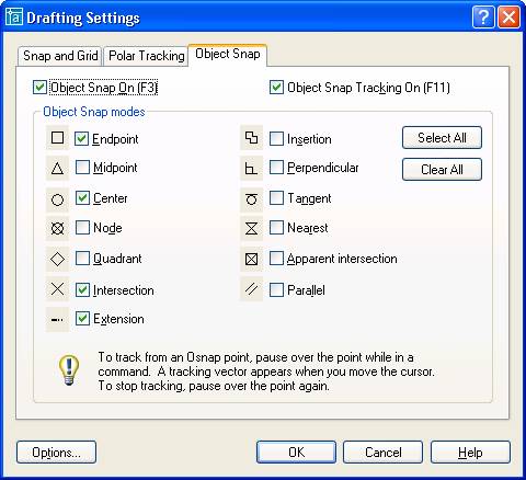 Se pot folosi modurile Osnap si la modul global, prin comanda Osnap, care determina sistemul AutoCad ca, de fiecare data cand va fi solicitata precizarea unui punct, sa ia in considerare modul OSNAP activat.De exemplu, comanda Osnap, urmata de marcarea, in caseta de dialog, a modurilor Midpoint si Intersection (fig. 1.9.), va indica programului AutoCad ca, de fiecare data cand se va cere indicarea unui punct, sa astepte mijlocul unei entitati sau intersectia a doua obiecte.
