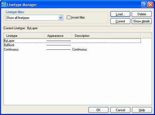 b) Alegerea tipului de linie, independent de strat, se realizeaza prin comanda Linetype, care afiseaza caseta de dialog din fig. 1.13.