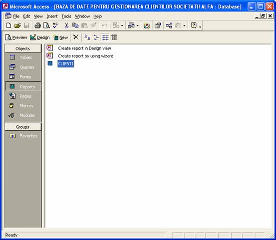 Din fereastra bazei de date pentru gestionarea clientilor societatii "ALFA" s-a ales ,Reports' si optiunea ,create report by using wizzard'.