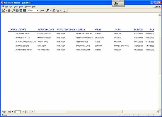 Pentru a lista raportul ,Clienti' se apeleaza functia ,Preview' din fereastra bazei de date sau se da dublu click pe raport, dupa care se alege ,Print' din meniul ,File'.