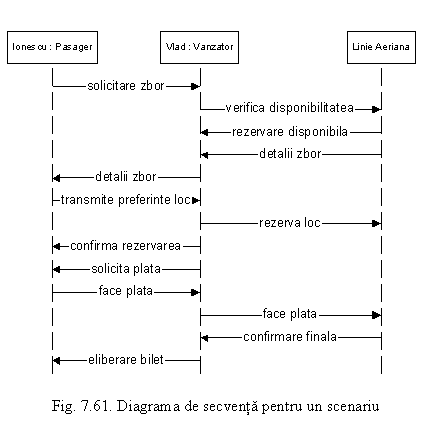 Diagrama de secventa este una dintre cele mai potrivite pentru a modela interactiunile intre obiectele sistemului. Se realizeaza cate o diagrama de secventa pentru fiecare caz de utilizare. In timp ce cazul de utilizare modeleaza un scenariu din puntul de vedere al utilizatorului, diagrama de secventa contine detalii de implementare ale scenariului, incluzand clasele si obiectele ce vor implementa scenariul si mesajele transmise intre obiecte. In mod obisnuit se analizeaza descrierea cazului de utilizare pentru a determina care sunt obiectele necesare pentru implementarea scenariului. Daca descrierea a fost facuta sub forma unei succesiuni de pasi obiectele se determina prin parcurgerea acestor pasi. Intr-o diagrama de secventa obiectele implicate in scenariu sunt reprezentate prin linii punctate verticale, iar mesajele transmise intre acestea prin vectori orizontali. Mesajele se reprezinta cronologic de sus in jos, spatierea pe orizontala a obiectelor fiind arbitrara. Pentru cazul de utilizare descris mai sus prin pasi ("Rezervare zbor") diagrama de secventa este prezentata in figura 7.61. Se observa ca pasii din descrierea cazului de utilizare se regasesc in secventa de sus in jos.