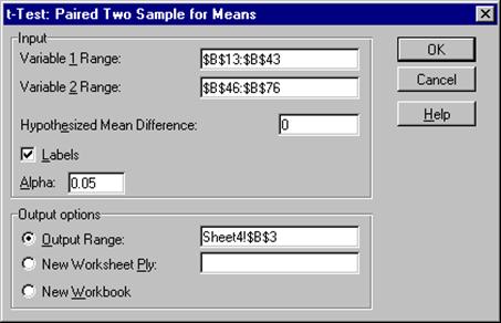 Se completeaza fereastra t-Test: Paired Two Sample for Means ca in figura 6.