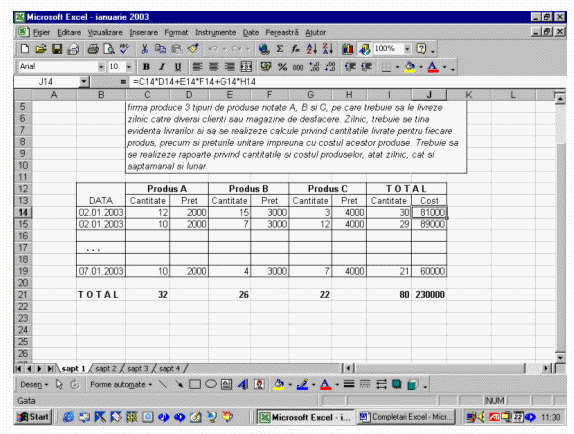 Pentru a concepe si proiecta o aplicatie pentru exemplul de mai sus, vom observa ca trebuie sa se proiecteze un tabel care sa contina urmatoarele informatii si calcule: ziua livrarii(data livrarii), denumirea produselor livrate, pentru fiecare produs pretul unitar, cantitatea livrata, costul total, totalul zilnic pe cantitate si cost.