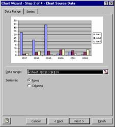 In partea de sus a etichetei Data Range vi se prezinta modul in care optiunile selectate vor afecta diagrama dvs. Actionati caseta Data range si apoi selectati datele pe foaia dvs. de lucru pe care doriti sa le reprezentati grafic. Daca selectati datele inainte sa porniti Chart Wizard, sau daca modificati datele sursa existente, zona poate sa apara deja in aceasta caseta. Butonul Collapse Dialog de la capatul din dreapta al acestei casete muta temporar caseta de dialog pentru ca sa introduceti zona prin selectarea celulelor in foaia de lucru. Cand terminati, puteti actiona butonul din nou pentru a afisa intreaga caseta de dialog.