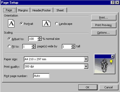 Daca actionati butonul Page din fereastra‑de‑dialog Page Setup, in fereastra apar urmatoarele elemente pe care le puteti folosi pentru a preciza formatul si orientarea paginii: