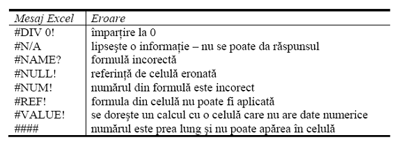 Daca Excel nu "intelege" ceea ce s-a introdus in celula respectiva apare un mesaj de eroare #NAME, #REF sau altceva ca in tabelul de mai jos.