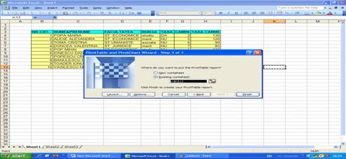 Pentru realizarea unui pivot table, trebuie sa dam un click undeva in tabel apoi sa mergem la DATA>PivotTable and PivotChartReport si dam click pe ea.
