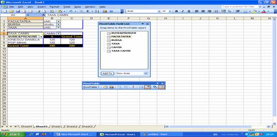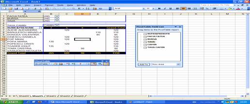numar curent, nume&prenume, facultatea, bursa, taxa, camin, taxa camin. Toate acestea fiind realizate in primul spatiu de lucru(SHEET1).