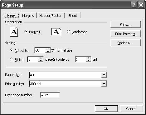 In meniul File (Fisier)- Page Setup (Setare Pagina), puteti defini zona de printare si de-asemenea alti parametrii care sunt inclusi in printarea propriu-zisa (antet si note de subsol, margini, etc).