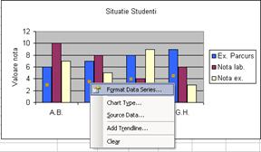 Modificarea culorilor unei serii de date in conditiile in care graficul este deja definit se face prin selectarea optiunii Format Data Series din meniul contextual apelat prin executarea de click dreapta de mouse pe unul din elementele (de ex. o coloana) seriei de date.