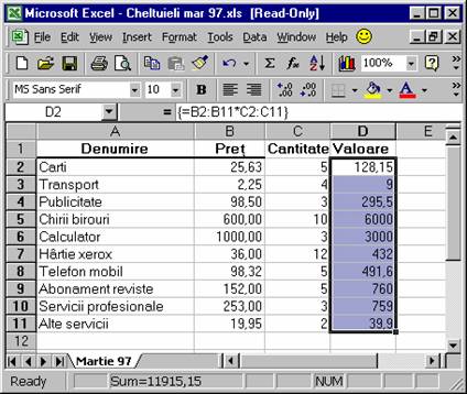 cantitatile, folosind o formula de tip matrice. Acoladele simbolizeaza ca