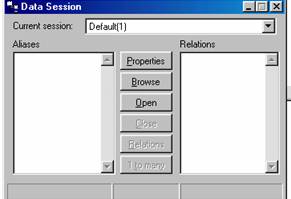 efect: Comanda deschide o fereastra de tip "Data Session" (Figura 6.9), care furnizeaza o modalitate comoda de a deschide baze de date, de a stabili relatii intre ele sau de a seta ori de a modifica diferite optiuni ale mediului Visual FOXPRO.