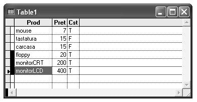 Ĭn aplicatiile reale se considera pentru campurile referitoare la numele si prenumele unor persoane sau la denumirile unor produse valori mai mari pentru proprietatea lungime maxima (WIDTH).Fiind prezentat un exemplu didactic, am limitat la 10 caractere denumirea produselor din tabel