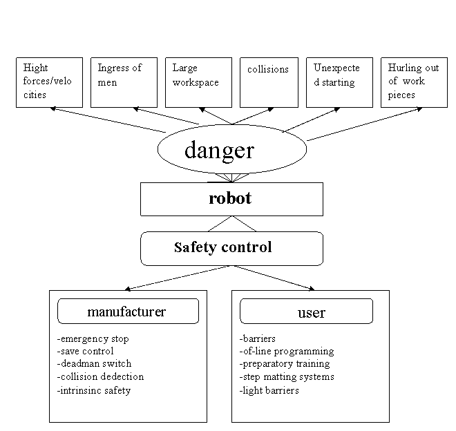 Masurile de siguranta pentru sistemele cu roboti trebuie sa prevada pericolul la care se poate expune atat utilizatorul, cat si robotul.De obicei se utilizeaza senzori care blocheaza miscarile robotului imediat ce acesta ajunge intr-un sector periculos . Cateva exemple de instalatii de siguranta sunt date mai jos :