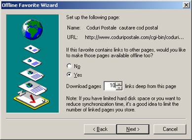 La apelarea optiunii de mai sus va porni un wizard-ul Offline Favorites Wizard, cu ajutorui caruia se copiaza pagina pe calculator parcurgand o serie de pasi: