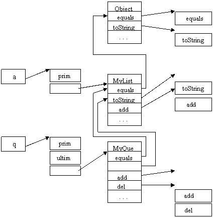 Fiecare obiect contine, pe langa datele nestatice din clasa, un pointer la tabela de metode virtuale (polimorfice). Compilatorul traduce un apel de metoda polimorfica printr-o instructiune de salt la o adresa calculata in functie de continutul variabilei referinta si de definitia clasei. Apelul "q.add" pleaca de la obiectul referit de variabile 'q' la tabela metodelor clasei 'MyQueue' si de acolo ajunge la corpul metodei 'add' din clasa 'MyQueue'. Apelul "q.toString" conduce la metoda "toString" din superclasa ("MyList") deoarece este o metoda mostenita si care nu a fost redefinita. Apelul "q.equals" merge in sus pe ierahia de clase si ajunge la definitia din clasa Object, deoarece nici o subclasa a clasei Object nu redefineste metoda "equals".