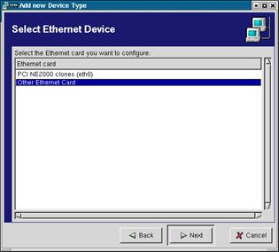 Adaugarea unei noi interfete de retea - pasul 2. Lista de aici contine tipurile de placi deja instalate in sistem, si "Other Ethernet Card