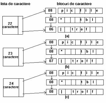 Disciplina de linie manipuleaza datele pe liste de caractere. O lista de caractere este o lista inlantuita de lungime variabila de blocuri de caractere si contine un contor care memoreaza numarul de caractere din lista. Un bloc de caractere contine un pointer spre urmatorul bloc de caractere din lista inlantuita, un mic sir de caractere care contine datele si un set de adrese care indica pozitia datelor valide in blocul de caractere (Figura 6.10). Adresa de start indica prima locatie a datelor valide din sir si adresa de sfarsit indica prima locatie de date care nu sunt valide.