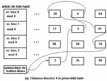 Cand cauta un bloc in sistemul de buffere (dupa numarul dispozitivului si cel de bloc), nucleul gaseste lista hash care ar trebui sa contina blocul. Apoi parcurge lista pana cand (primul scenariu) gaseste buffer-ul ale carui numere de dispozitiv si de bloc se potrivesc cu cele cautate. Nucleul verifica daca buffer-ul este liber, si daca este, marcheaza buffer-ul 'ocupat' astfel incat alte procese sa nu-l mai poata accesa. Apoi nucleul scoate buffer-ul din lista buffere-lor libere , deoarece un buffer nu poate fi simultan si ocupat si in lista buffere-lor libere. Daca alte procese incearca sa acceseze blocul pe timpul cat buffer-ul este blocat, acestea se pun in asteptare pana cand buffer-ul este eliberat. Figura 3.5 descrie primul scenariu, in care nucleul cauta blocul 4 in lista hash marcata 'numarul blocului 0 mod 4'.