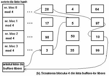 Gasind bufferul, nucleul il scoate din lista buffere-lor libere si realizeaza legatura directa intre blocurile 5 si 28.Inainte de a continua cu alte scenarii, sa vedem ce se intampla cu un buffer dupa ce este alocat. Nucleul poate citi date de pe disc in buffer, sau poate sa scrie date in buffer sau posibil pe disc. Nucleul lasa buffer-ul marcat 'ocupat', pentru ca nici un alt proces sa nu-l poata accesa si sa nu-i poata schimba continutul cat timp este ocupat, pastrandu-se astfel integritatea datelor din buffer.