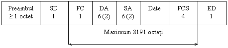 Cand o statie poseda jetonul ea este autorizata sa emita una sau mai multe trame intr-un timp limitat superior, dupa care aceasta transmite jetonul statiei vecine in aval in inelul logic. Operatia se efectueaza printr-un trame particular, token, indicand in mod explicit adresa statiei vizate. Odata emis acest jeton adresat, statia trebuie sa verifice ceea ce executa statia situata in aval si sa ia eventuale masuri corective. Mai mult statia care detine jetonul poate permite unor noi statii sa se integreze in inelul logic. Un sistem de prioritati poate permite, pentru anumite fluxuri de date, garantarea obtinerii unei parti din debitul disponibil. Structura unui trame in IEEE 802.4 se prezinta in fig. 6. Preambulul necesar pentru sincronizarea bit este format din unul sau mai multi octeti.