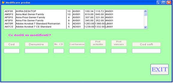 Utilizatorul va selecta din lista produsul pe care doreste sa il modifice si apoi va completa caseta corespunzatoare campului pe care vrea sa il schimbe. Dupa modificare va aparea o noua lista in care produsul va apare cu modificare facuta.